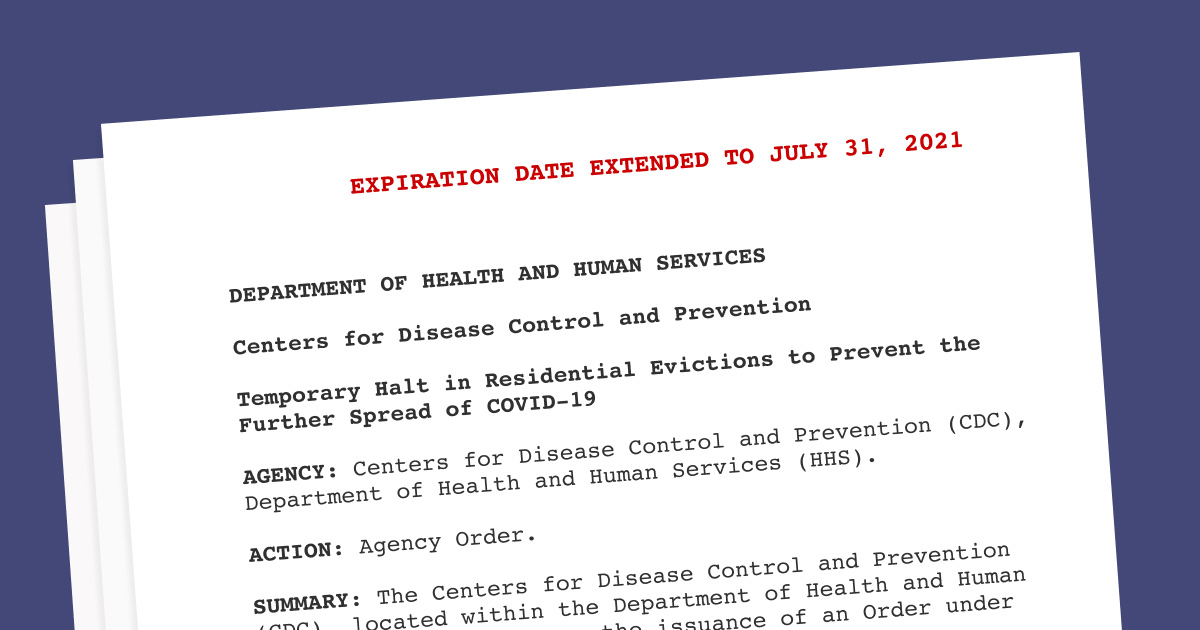 The Eviction Lab last provided an overview about the CDC order in September 2020. The CDC order went into effect on September 4th, 2020, and originally was set to expire on December 31st, 2020. The CDC moratorium has been extended four times, once by Congress to January 31st, 2021, and again by the CDC to March 31st, 2021, then June 30, and most recently until July 31, 2021.